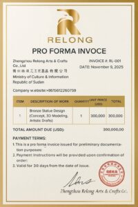 إلى ذلك، تحصلت «عين الحقيقة» على صورة من فاتورة مبدئية «Pro Forma Invoice» صادرة عن شركة Zhengzhou Relong Arts & Crafts Co., Ltd الصينية، وموجهة إلى وزارة الثقافة والإعلام في حكومة بورتسودان، بتاريخ 9 نوفمبر 2025م، وتحمل الرقم «RL-001».