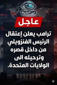 أخبار عاجلة ترامب يُعلن اعتقال الرئيس الفنزويلي من داخل قصره وترحيله إلى الولايات المتحدة الأمريكية.. عااااجل: عين الحقيقة By Ain Elhagega On يناير 3, 2026 Share Share FacebookTwitterGoogle+ReddItWhatsAppالبريد الإلكترونيFacebook MessengerTelegram