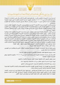 ونص القرار على أن تبدأ اللجنة أعمالها فوراً، مع منحها صلاحية الاستعانة بمن تراه مناسباً لإنجاز مهامها، على أن تنتهي ولايتها بإعلان نتائج امتحانات الشهادة السودانية، مع إلزام جميع الجهات المختصة بتقديم الدعم اللازم لتمكينها من أداء مهامها.